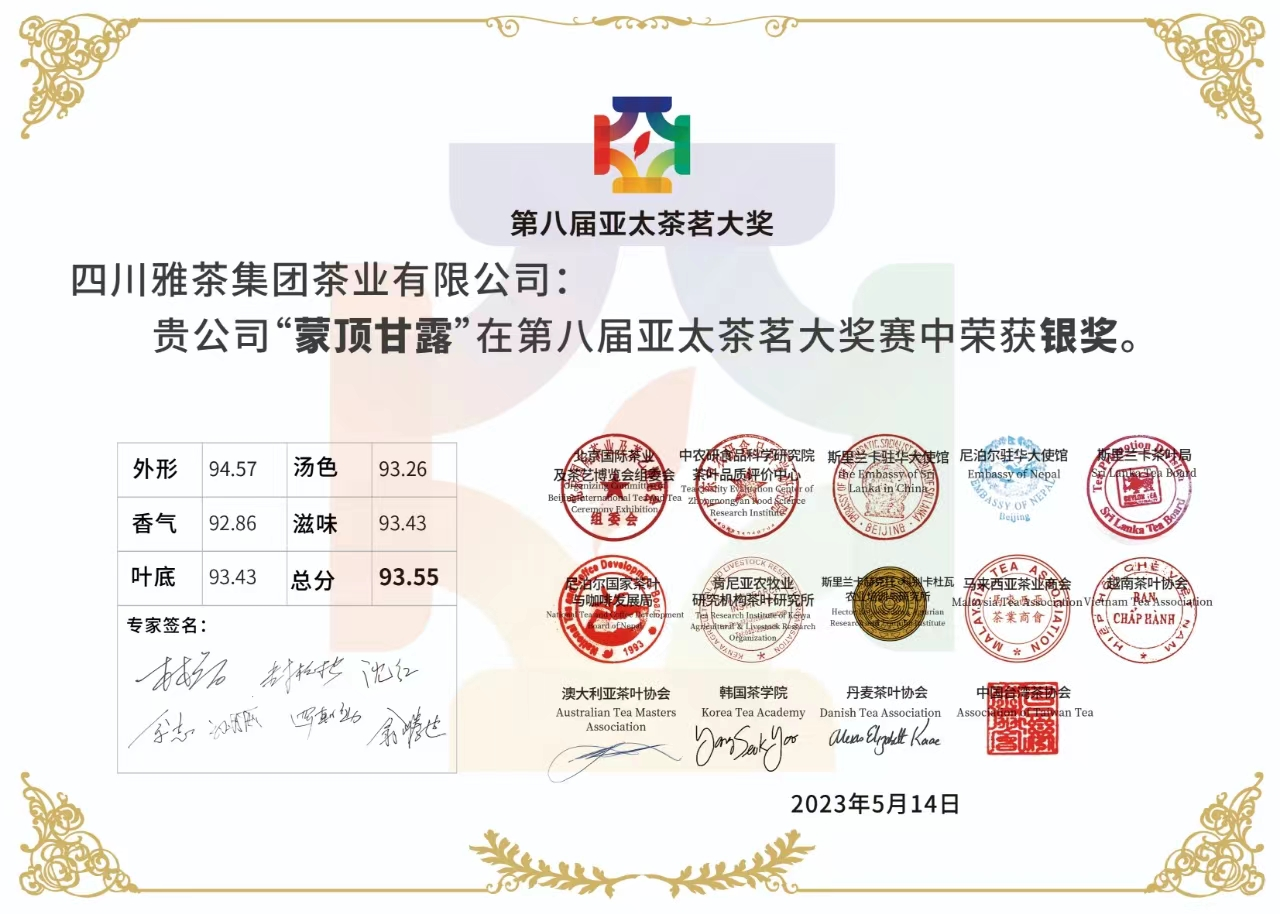 雅茶集團(tuán)茶業(yè)公司“蒙頂甘露” 獲第八屆亞太茶茗大賽銀獎(jiǎng)